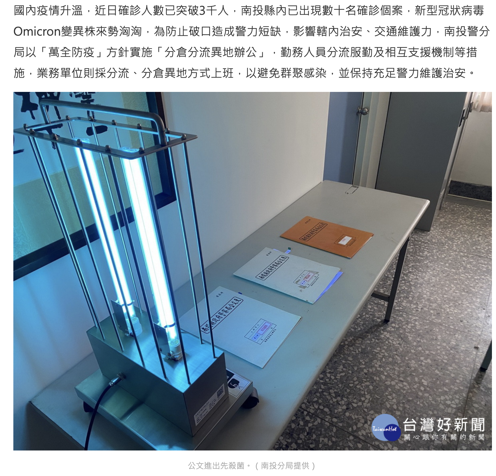 國內疫情升溫,近日確診人數已突破3千人,南投縣內已出現數十名確診個案,新型冠狀病毒Omicron變異株來勢洶洶,為防止破口造成警力短缺,影響轄內治安、交通維護力,南投警分局以「萬全防疫」方針實施「分倉分流異地辦公」,勤務人員分流服勤及相互支援機制等措施,業務單位則採分流、分倉異地方式上班,以避免群聚感染,並保持充足警力維護治安。